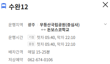 광주 수완12번 버스 운행노선 무등산국립공원(증심사)→성촌마을.전통문화관→학운초교→동산마을입구→운림중→연진회미술원→홍림교→학동무등파크→학동증심사입구역→조선대병원→전남대병원.남광주시장→전남대병원오거리/남동성당→문화전당역→국립아시아문화전당(구.도청)→충장동행정복지센터→향교→대성초교→대성사거리→까치고개→백운초교(북)→백운우체국→주월주택단지→신우아파트→월산5동→월산4동→건강협회→상공회의소→화정중흥파크→신세계백화점(북)→광천치안센터→운암도서관→운암중→운암우미아파트→시립장애인복지관→동림푸른마을→산동교→반촌/마한유적체험관→보건대입구→전남공고입구→신창용수마을→신창초교→신창중→신창부영2차아파트→은빛마을→수완모아엘가→광주농수산물유통센터(북)→광주농수산물유통센터(서)→수완중흥S-클래스 2차→흑석사거리(동)→흑석사거리(서)→광산세무서→하남초교→하남2지구→하남1교→하남3지구모아엘가→돈보스코학교→돈보스코학교→하남3지구모아엘가→하남1교→하남2지구→하남초교→광산세무서→흑석사거리(서)→흑석사거리(동)→수완중흥S-클래스 2차→광주농수산물유통센터(서)→광주농수산물유통센터(북)→수완모아엘가→성덕교→은빛마을→신창부영2차아파트→신창중→신창초교→신창용수마을→전남공고입구→보건대입구→반촌/마한유적체험관→산동교→동림푸른마을→시립장애인복지관→운암우미아파트→운암중→운암도서관→운암벽산블루밍→광주예술의전당→광천치안센터→신세계백화점→화정중흥파크→상공회의소→건강협회→월산4동→월산5동→신우아파트→주월주택단지→백운우체국→까치고개→대성사거리→대성초교→향교→중앙대교(서)→충장치안센터→국립아시아문화전당(구.도청)→문화전당역→전남대병원오거리/남동성당→전남대병원.남광주시장→남광주사거리→조선대병원→학동증심사입구역→학2마을아파트→학동평화맨션→홍림교→연진회미술원→운림중→학운초교→성촌마을.전통문화관→무등산국립공원(증심사)