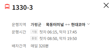 1330-3번 버스는 왕복 운행 거리가 약 134km에 달해, 경기도 직행좌석버스 중에서도 손꼽히는 장거리 노선입니다. 고속도로를 거치지 않는 직행좌석버스 중 가장 긴 노선으로 알려져 있습니다. 가평 터미널에서 5~10분 정도 정차 시간을 가지며, 이는 운전기사의 휴식과 승객들의 편의를 위한 것으로 이용객 입장에서는 여유를 가질 수 있는 시간입니다.