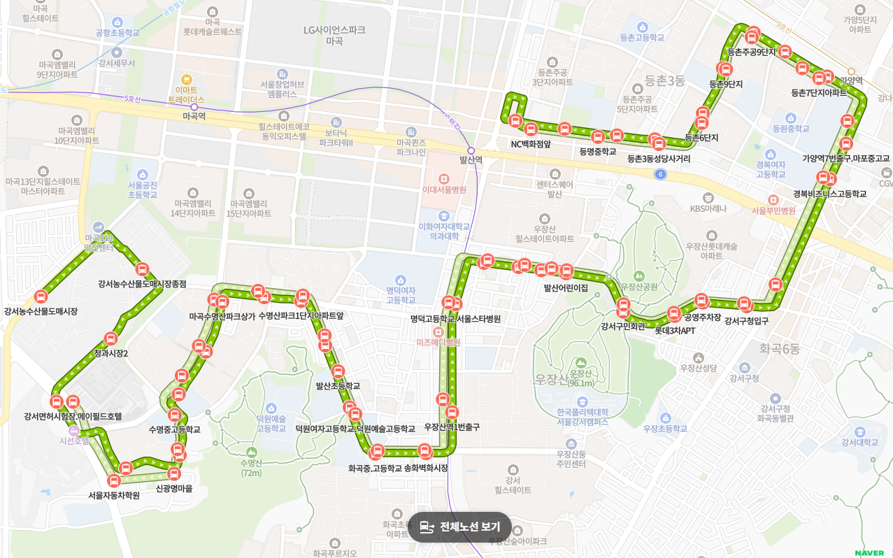 우장산과 수명산 근린공원 인근을 지납니다. 주말이나 평일 오후에 산책을 즐기려는 주민들이 자차 없이도 쾌적한 숲세권으로 이동할 수 있게 해주어 지역 주민들의 삶의 질을 높여줍니다.