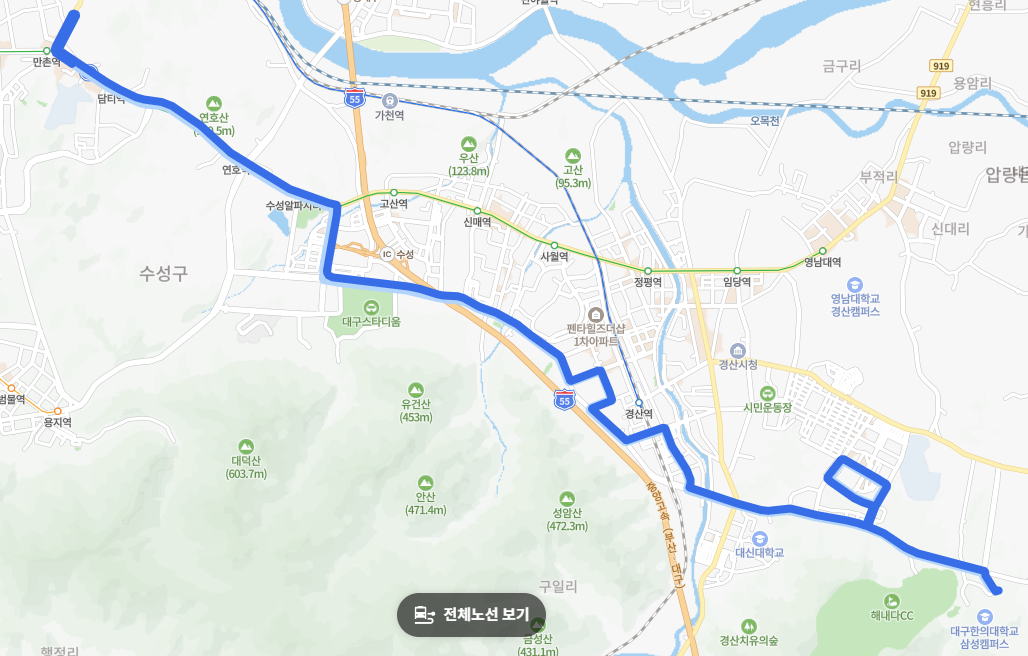 ● 주요 경유지: 대구한의대학교 - 사동 - 옥곡동 - 대구시지노인전문병원 - 대구스타디움 - 수성알파시티역