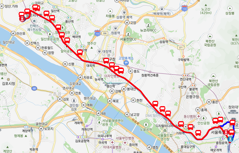 직통 노선: 일산신도시에서 서울역, 숭례문까지 직통으로 연결되어 이동 시간을 단축시켜 줍니다.