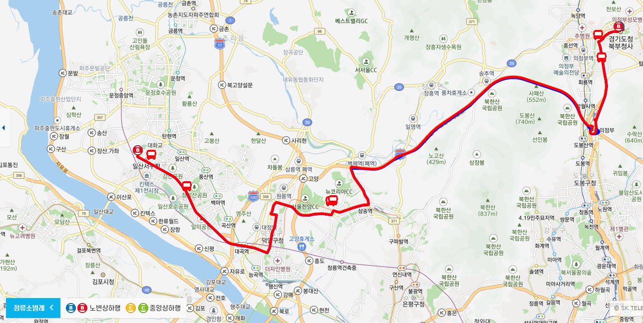 운행노선 고양공영차고지→대화역(중)→주엽역(중)→일산동부경찰서(중)→일산동구청(중)→마두역(중)→백석동.요진와이시티(중)→대곡역(중)→토당육교(경유)→화정역.롯데마트→덕양구청→화정1동행정복지센터→신원당마을입구→원당역→원흥역2번출구→삼송역4번출구→신원중학교(중)→양주영업소→노고산(경유)→송추IC(경유)→사패산터미널진입(경유)→호원IC(경유)→의정부IC출입(경유)→장암역.석림사입구→장암역삼거리(경유)→장암IC(경유)→장암주공5단지.한국.풍림아파트→추동아파트→은하수아파트→의정부우체국→경기도청북부청사→경기도청북부청사→의정부우체국→은하수아파트.신곡2동주민센터→신동초.신동아파밀리에아파트앞→장암주공5단지앞→장암IC(경유)→장암역삼거리(경유)→장암역.석림사입구→의정부IC진입(경유)→송추IC(경유)→노고산(경유)→양주영업소→신원중학교(중)→삼송역5번출구→원흥역3번출구→원당역→신원당마을입구→화정1동행정복지센터→화정역.덕양구청→별빛마을8단지.롯데마트→토당육교(경유)→대곡역(중)→백석동.요진와이시티(중)→마두역(중)→일산동구청(중)→일산동부경찰서(중)→주엽역(중)→대화역(중)→고양공영차고지