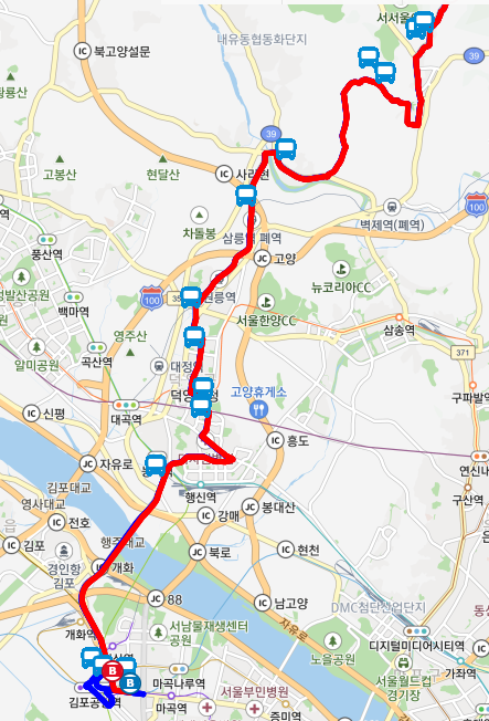 운행노선고양동종점.로뎀빌라→장단상회→보광주유소→추모공원하늘문→상곡마을→부대앞.감로정→보라빌라→고양동삼거리→푸른마을10단지.대명교회앞→신성빌라.동익아파트→고양동사거리→고양동시장→국민은행→고양동현대아파트→세종명가빌라→청구아파트→윤창아파트→평산빌라→천사의집→LG물류센터→하늘소리요양원입구→중부대학교입구→천주교묘→경기축산→윗대자골→장군묘앞→동서기획→대자동마을회관→미타원입구→대자교→통일로불가마→필리핀참전비→새서울아파트→더퍼스트프라임→관산동.벽제시장→관산주공아파트.관산동행정복지센터→고양외고.고양제일중학교→벽제교.관산삼거리→벽제교삼거리→쥬쥬테마동물원→청대골→삼릉역→다락골→왕릉골→부대앞→윗배다리→원릉역→원당초등학교입구→주교동.원릉방앗간→고양시청→성사2동행정복지센터→고양어울림누리.달빛마을1단지→화정1동행정복지센터→명지병원.달빛마을3단지→화정동단독주택단지→화정역.덕양구청→화정역3호선→이마트→화정2동행정복지센터→옥빛17단지.롯데마트고양점→행신초등학교→샘터마을2단지→가라뫼.한전앞→무원고교→행신SK뷰아파트→행신동삼거리→토당초등학교.우창프라자→능곡화원→행주IC(경유)→개화IC(경유)→개화역1번출구.개화검문소→개화119안전센터→방화중학교→롯데몰.김포공항역→국제선진입(경유)→김포공항국제선(2번홈)→한국공항공사→김포공항국내선(10번홈)→공항동(경유)→송정역(중)→KT공항지사(경유)→송정역