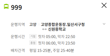 고양 999번버스운행노선 고양종합운동장.일산서구청→대화역(중)→백병원(중)→문촌마을14.19단지→킨텍스꿈에그린.원시티1단지→원마운트→한수초등학교→주엽역(중)→강선마을(중)→발산중학교→저동초교삼거리→저동중고교→밤가시7.8단지.광림교회→풍산역→애니골입구→해들마을→삼성캐슬.삼학법보사→고양가구3단지입구→전원마을입구→동국로삼거리→고양국제고등학교→위시티1.3단지→위시티3.4단지→위시티주상복합단지→위시티5단지→위시티입구→동국대병원사거리→은행마을3단지.일산자이센트리지.일산자이더헤리티지→식사동→식사오거리→원당중학교→양조장→고양시청→신원당마을입구→원당역→흥도동행정복지센터→훼릭스→삼송마을11단지.대학생연합생활관→원흥역4번출구→원흥역7번출구→삼송마을14단지.농협대입구→신원마을9.10단지→신원마을6단지→신원마을5단지→신원마을4단지→신원중학교