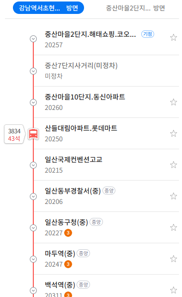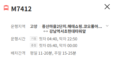 고양 M7412번 버스 운행노선 중산마을2단지.해태쇼핑.코오롱아파트 → 중산마을10단지.동신아파트 → 산들대림아파트.롯데마트 → 일산국제컨벤션고등학교 → 일산동부경찰서(중앙차로) → 일산동구청(중앙차로) → 마두역(중앙차로) → 백석역(중앙차로) → 신사역.푸른저축은행(중앙차로) → 논현역(중앙차로) → 신논현역.(구)교보타워사거리→ 강남역서초현대타워앞