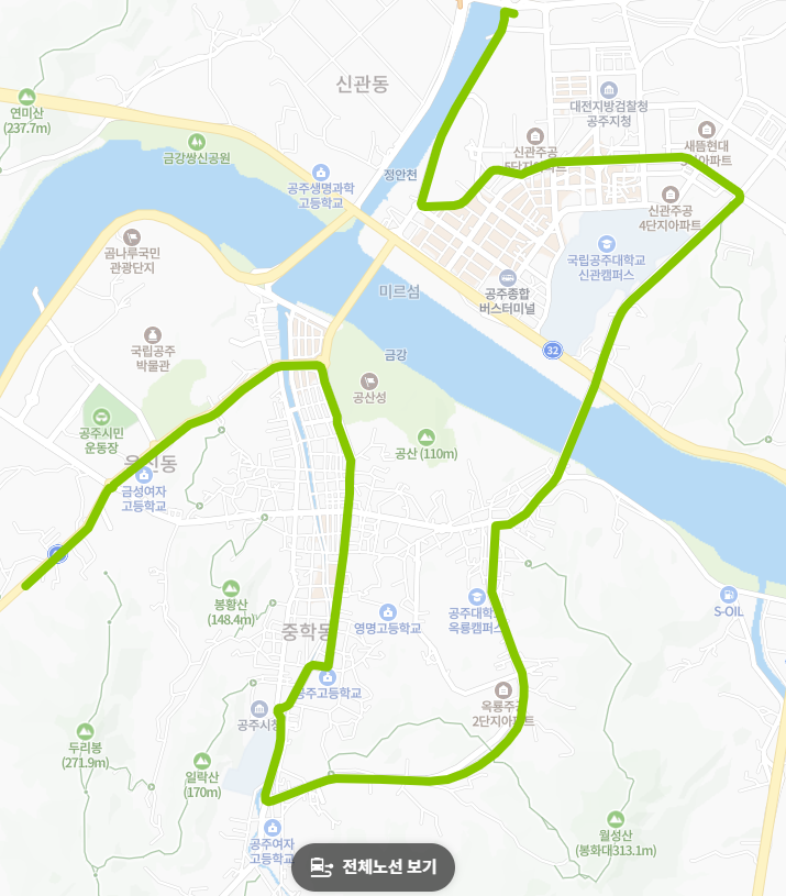 행정 중심지 경유: '공주경찰서', '공주의료원', '시청' 등 주요 공공 기관을 경유하여 민원 처리나 병원 이용 시 시민들의 접근이 용이합니다.