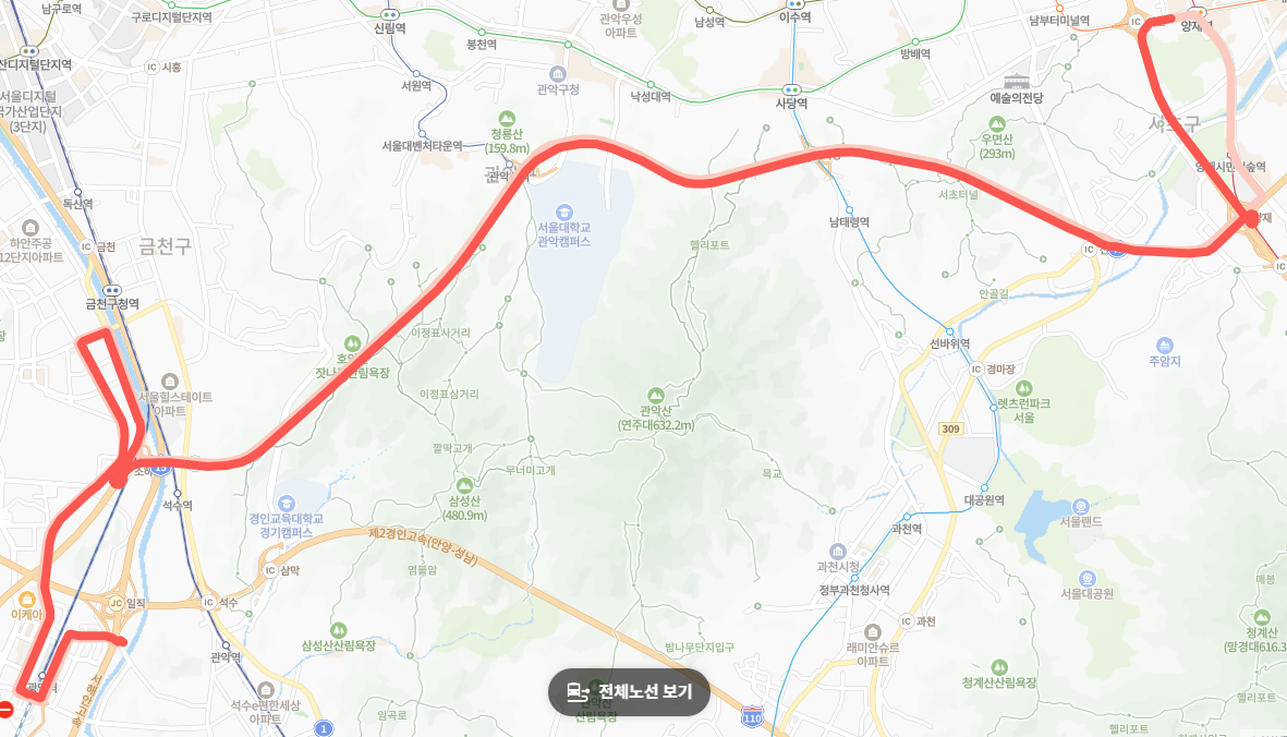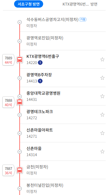 석수동버스공영차고지(미정차)→광명역로진입(미정차)→KTX광명역6번출구→광명역B주차장→중앙대학교광명병원→광명테크노파크→신촌마을아파트→신촌마을→금천(미정차)→봉천터널진입(미정차)→사당IC(미정차)→선암TG(미정차)→양곡도매시장→양재IC(미정차)→서초구청
