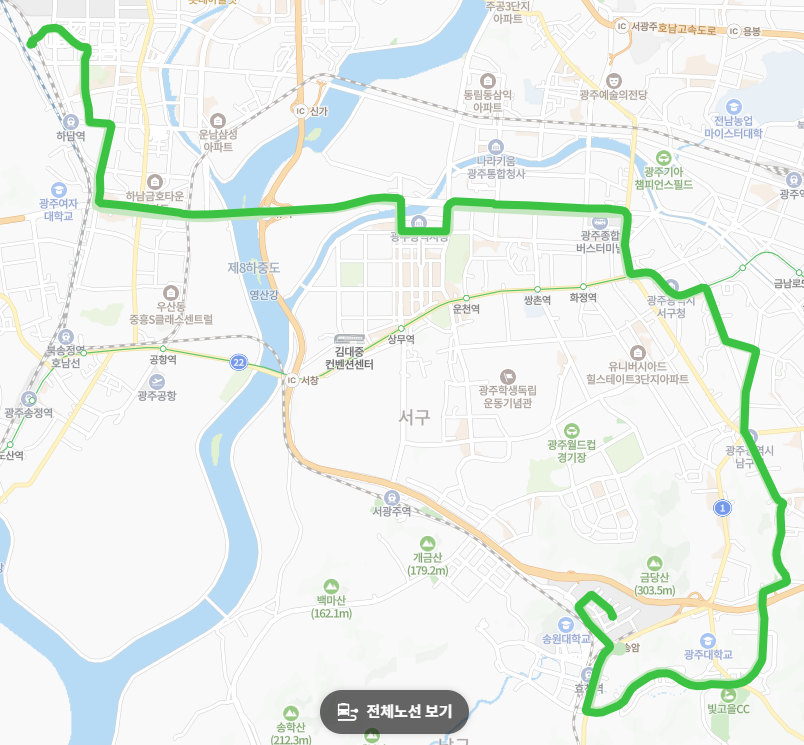 광주 시청: 상무지구에 위치한 광주 시청 앞을 경유하여 공공기관 업무 방문객 및 상무지구 직장인의 이동을 돕습니다.