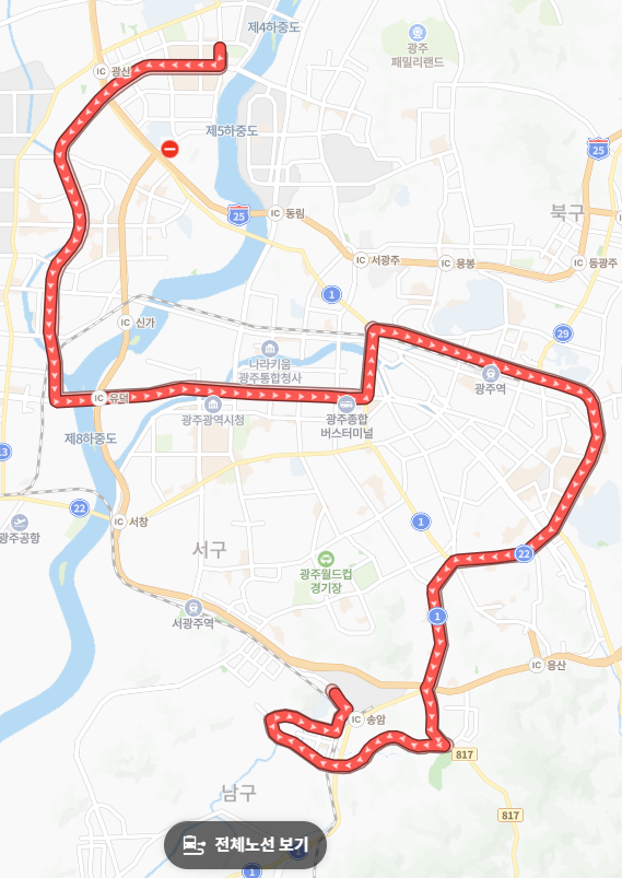 5개 구 경유: 광주광역시의 5개 자치구(광산·서·북·동·남구)를 모두 거치는 몇 안 되는 알짜배기 노선입니다.
