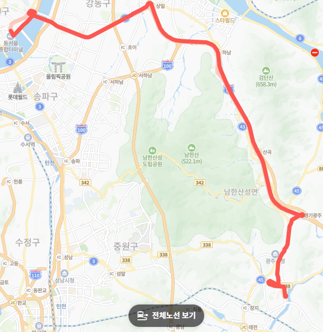 고속도로 경유: 중간에 여러 정류장을 거치지 않고 고속도로를 이용하여 이동 시간이 단축됩니다. (13번 버스 등 다른 노선에 비해 하남시, 남한산성면 등 여러 지역을 경유하지 않아 훨씬 빠릅니다.)
