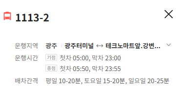 광주 1113-2번 버스 운행노선 광주터미널 (기점)→ 뉴광주농협주유소→ 파발교.최영일산부인과→ 보건소.공설운동장→ 광주시자원봉사센터입구→ 파라다이스아파트→ 송정초등학교→ 밀목.광주시청앞→ 밀목빌라단지→ 밀목주유소.21세기자동차학원→ 솔치마을→ 번천초교.광주IC. (이후 중부고속도로 진입)→ 경기광주IC, 산곡JC, 동서울TG, 하남JC (고속도로 미정차 구간)→ 상일초등학교 (서울외곽순환고속도로 상일IC 진출)→ 초이동(중)→ 강동자이.프라자아파트(중)→ 길동주민센터.둔촌2동주민센터(중)→ 길동사거리.강동세무서(중)→ 강동역(중) (서울 지하철 5호선, 8호선 환승)→ 천호역(중) (서울 지하철 5호선, 8호선 환승)→ 광진청소년센터→ 천호대교북단, 올림픽대교북단 (미정차)→ 테크노마트앞.강변역(D) (종점, 서울 지하철 2호선 환승)