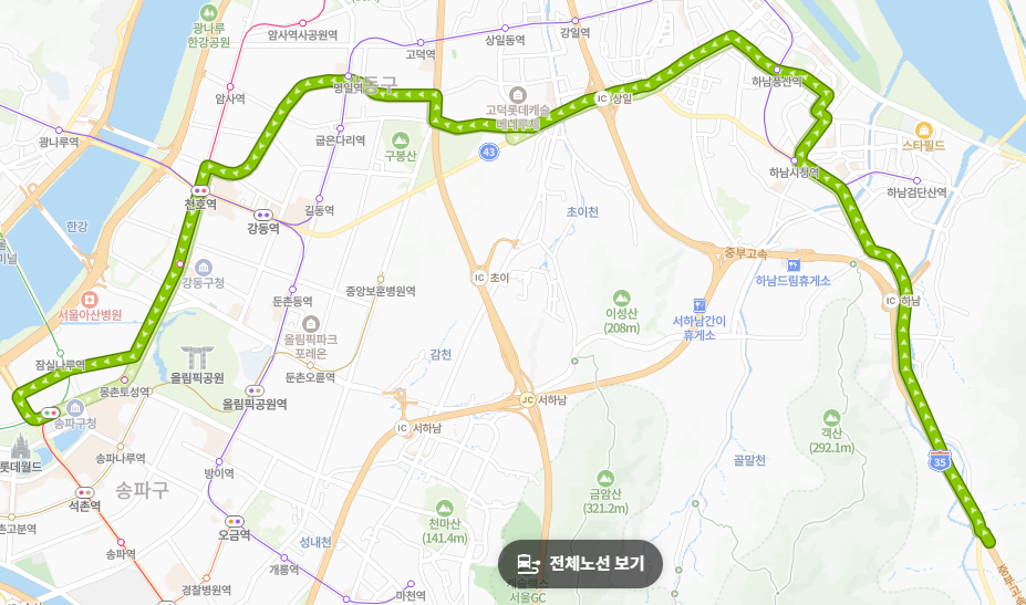 하남과 서울을 연결하는 노선 특성상, 장거리 통행의 효율성을 확보하기 위해 주요 도로와 교량을 이용하며 운행합니다.
