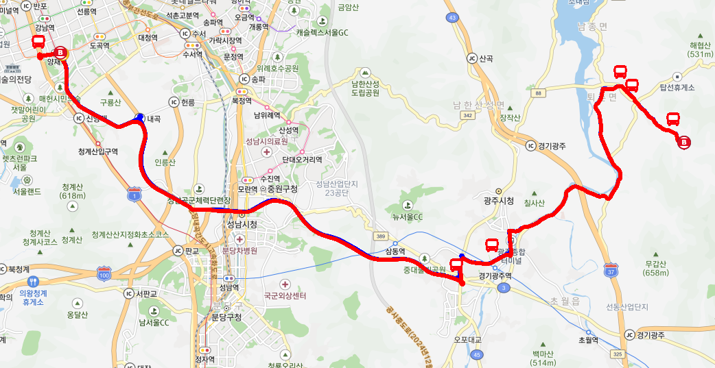 운행노선 - 관음3교→풍경마을앞→주목마을→관음2리마을회관→교회앞→삼환아트빌라→파크빌리지 →관음1리.새마을슈퍼→도수마을회관 →도수초교 →퇴촌농협 →퇴촌면사무소→경안천습지생태공원→정지1리.토마토마을건너→정지2리→나눔의집→무갑삼거리→세광아파트→지월3리마을회관입구→송정동.금강아파트→브라운스톤아파트→우림필유→광주고입구→광주터미널.참조은병원앞→경안장례식장.이편한세상광주역아파트→장지IC(경유)→광주직동IC(경유)→섬말IC(경유)→성남대원IC(경유)→여수대로IC(경유)→내곡터널진입(경유)→내곡IC(경유)→염곡IC(경유)→매헌시민의숲.양재꽃시장→교육개발원입구(중)→양재역.서초문화예술회관(중)→양재역.서초문화예술회관(중)