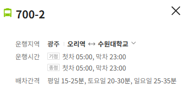광주 700-2번 버스 운행노선 오리역→하얀마을.구미도서관→미금역.2001아울렛→동원동→머내기업은행→동천역→KT수지지사.물류센터→현대그린푸드→초입마을.삼익풍림동아아파트→수지중학교→수지고등학교.삼성4차아파트→동문아파트.삼성2차아파트.동부아파트→삼성1차.보원.건영아파트→한성아파트.한국아파트.현대1차아파트→수지구청역→주공아파트→신월초교.상록아파트.주공9단지→풍덕천2동행정복지센터.현대성우아파트→정평중학교.공무원아파트.상록아파트6단지→정평공원.진흥아파트→이마트→태영.대우아파트→LG빌리지2차.두산기술원→풍산아파트.벽산아파트.힐스테이트→서원말.심곡서원.상현지구대.금호.현대아파트→포레나광교상현→광교상현마을현대아파트→광교마을.린병원.독바위→광교역사공원.광교카페거리→경기대수원캠퍼스후문.수원박물관→경기남부경찰청.봉녕사입구→우만주공4단지→수원시평생학습관.연무사회복지관.창룡도서관→창룡문.연무대→수원미디어센터→팔달구청.수원화성박물관→화성행궁.여민각→팔달구청.화성행궁.수원성지→장안문.수원전통문화관→장안공원→(구)한국은행→화서문로터리→글로벌청소년드림센터→병무청입구.한국소방안전원경기지부→수원여고.농천교회.수원역푸르지오자이→고등동사거리.고등동행정복지센터.수원역푸르지오자이→고등동삼거리→수원역환승센터(3승강장)→공구유통타운.중앙자동차매매단지→중보교.수원역자동차운전전문학원→고색동입구→고색파출소.종합공구단지→연안아파트.삼성큰병원→고색역.고색초교.태산아파트→서수원주민편익시설→오목천동삼거리.남광하우스토리아파트→오목천동사거리→오목천역.영신여자고교.청구아파트→수영오거리.방송통신대입구→국립축산과학원→수영리검사소→화성시민캠퍼스→신일우남아파트→SK매직.우림그린빌리지→봉담이마트→와우농협앞→와우지구→수원대학교