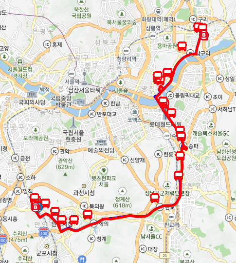 직통 노선: 구리시내에서 잠실역까지 직통으로 연결되어 이동 시간을 단축시켜 줍니다.