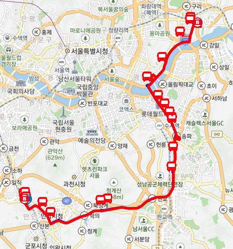 중앙버스전용차로 이용 (일부 구간): 송파대로 구간에서 중앙버스전용차로를 이용하여 정체 영향을 덜 받고 빠르게 이동할 수 있습니다.