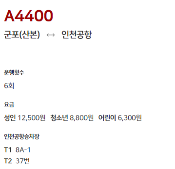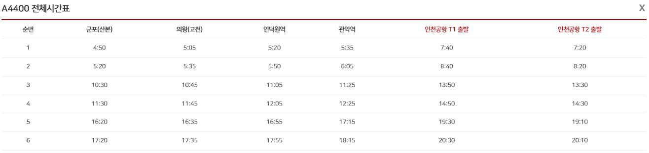 4400번 버스 운행노선 - 군포.산본(공항버스)→고천동주민센터→인덕원역8번출구→양명고교(미정차)→관악역(공항버스)→석수IC(미정차)→광명IC(미정차)→안현JC(미정차)→신천IC(미정차)→서창JC(미정차)→남동IC(미정차)→문학IC(미정차)→옥련IC(미정차)→인천대교(미정차)→인천대교TG(미정차)→제1여객터미널진입1(미정차)→제1여객터미널진입2(미정차)→제1여객터미널진입3(미정차)→제1여객터미널진입4(미정차)→인천공항3층출국장(T1)→인천공항전망대(미정차)→인천공항3층출국장(T2)