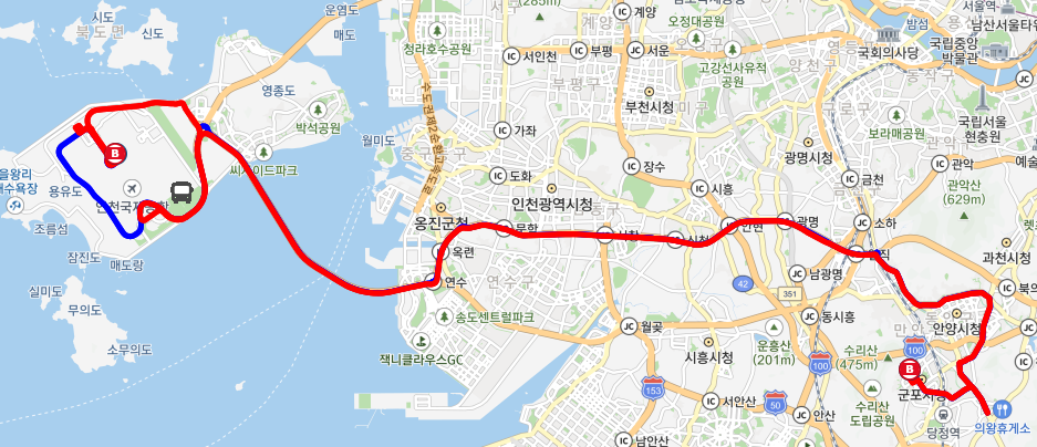 환승 없이 편리: 군포에서 인천공항까지 환승 없이 한 번에 이동할 수 있어 편리합니다.