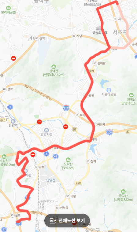● 고속화 도로 이용으로 빠른 이동: 의왕TG, 남태령을 거쳐 서울 도심으로 진입하므로 비교적 빠른 이동이 가능합니다. 서울 시내에서도 남산1호터널 등을 이용하며, 주요 간선도로를 경유하여 시간을 단축합니다.