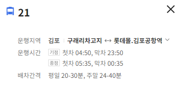김포 21번 버스 운행노선 구래리차고지→금성백조예미지→김포한강3차푸르지오→나비마을삼거리→구래동행정복지센터→한강반도유보라5차→구래역→솔터마을입구→힐스테이트.경남아너스빌→마산역→김포생활체육관→한양수자인아파트→뉴고려병원→타운하우스→중흥s클래스후문→한강센트럴자이→자이타워→김포경찰서후문→걸포교(경유)→북변IC(경유)→고촌교(경유)→향산교(경유)→장곡.고촌고등학교→천등고개→고촌역→아라대교→개화역광역환승센터→개화역1번출구.개화검문소→개화119안전센터→방화중학교→롯데몰.김포공항역