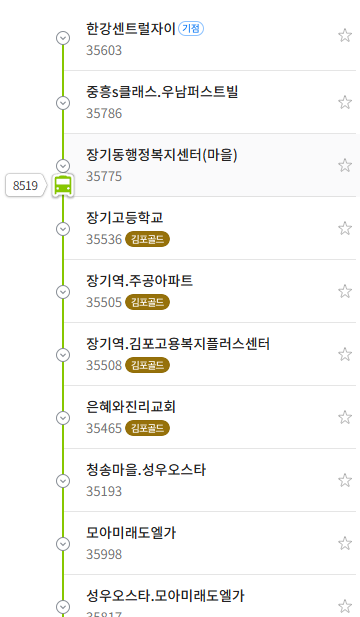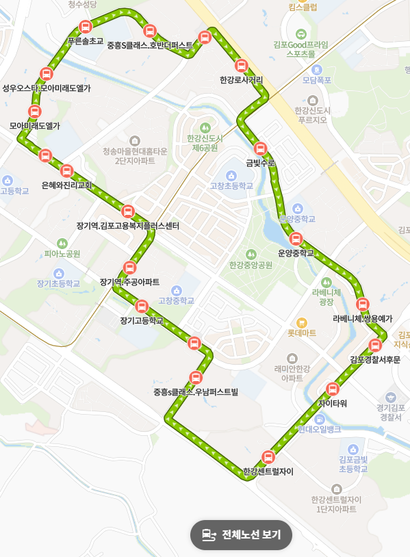 장기동 한강센트럴자이와 같은 대단지 아파트에서 **장기역(김포 골드라인)**이나 서울행 광역버스(M6117, M6427 등)를 탈 수 있는 주요 정류장으로 빠르게 데려다주는 '셔틀' 역할을 훌륭히 수행합니다.