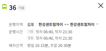 김포 36번 버스 운행노선 한강센트럴자이→중흥S클래스.우남퍼스트빌→장기동행정복지센터(마을)→장기고등학교→장기역.주공아파트→장기역.김포고용복지플러스센터→은혜와진리교회→청송마을.성우오스타→모아미래도엘가→성우오스타.모아미래도엘가→푸른솔초교→중흥S클래스.호반더퍼스트→장기본동행정복지센터(마을)→한강로사거리→금빛수로→운양중학교→라베니체.쌍용예가→김포경찰서후문→자이타워→한강센트럴자이