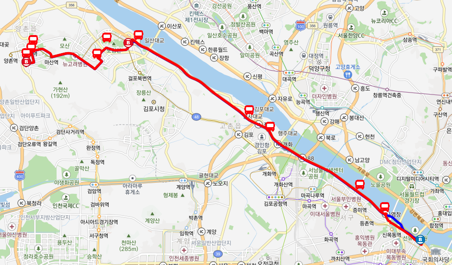 운행노선-구래리차고지→한강센트럴블루힐.모아엘가2차→솔터마을3단지→레이크에일린의뜰→자이더빌리지→뉴고려병원→중흥s클래스후문→한강센트럴자이→롯데마트.래미안한강아파트→수정마을.쌍용예가→전원마을1단지.김포한강롯데캐슬→전원마을3단지.KCC스위첸→화성파크드림.KCC스위첸→한옥마을.아트빌리지→김포한강신도시IC(경유)→한강시네폴리스IC(경유)→신곡IC(경유)→개화IC(경유)→88JC(경유)→양천고성지(경유)→가양대교남단(경유)→염창교(경유)→성산대교남단(경유)→양화대교남단(경유)→당산역광역환승센터(1번승강장)