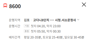김포 8600번 버스 운행노선 고다니8단지→곡촌마을.금호어울림1단지→한가람마을우미린.호수이편한세상→구래역→화성파크드림.솔터마을입구→힐스테이트.경남아너스빌→마산역→뉴고려병원→우미린.반도유보라아파트→장기역.주공아파트→장기역.김포고용복지플러스센터→은혜와진리교회→청송2.3단지→청송1단지.중흥S클래스→한강로사거리→반도유보라2차.김포대학교→운양역→하늘빛마을→한신더휴테라스→김포한강신도시IC(미정차)→한강시네폴리스IC(미정차)→신곡IC(미정차)→개화IC(미정차)→88JC(미정차)→양천고성지(미정차)→가양대교남단(미정차)→염창교(미정차)→성산대교남단(미정차)→당산역2번출구→영등포전화국교차로(미정차)→의원회관앞교차로(미정차)→여의도환승센터(2번승강장)→마포대교(미정차)→마포역(중)→공덕역→충정로역→서대문역사거리→서울역사박물관.경희궁앞(중)→광화문역6번출구→시청.서소문청사
