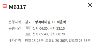 김포 M6117번 버스 운행노선 양곡터미널 → 구래역 → 힐스테이트.경남아너스빌 → 마산역 → 뉴고려병원 → 장기역.주공아파트 → 반도유보라2차.김포대학교 → 운양역 → 합정역(중) → 홍대입구역(중) → 신촌오거리.현대백화점(중) → 신촌오거리.2호선신촌역(중) → 충정로역 → 서울역