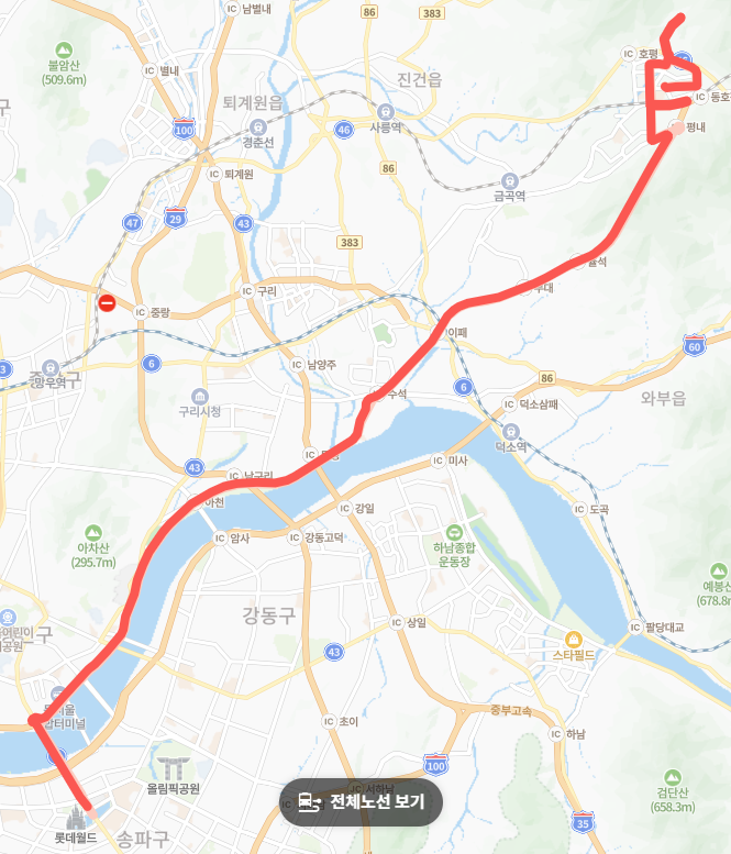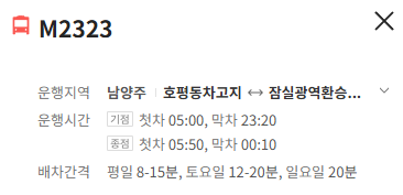 남양주 M2323버스 운행노선 호평동차고지→호평중흥S클래스.한라.주공아파트→호평도서관.라인아파트.호평파라곤아파트→호만마을.호평중흥아파트→판곡초등학교.현대아이파크→호평상업지구.이마트→두산알프하임입구→평내IC(미정차)→수석IC(미정차)→천호대교북단(미정차)→올림픽대교북단(미정차)→잠실대교북단(미정차)→잠실대교남단(미정차)→잠실광역환승센터