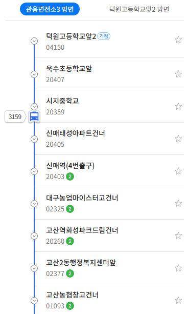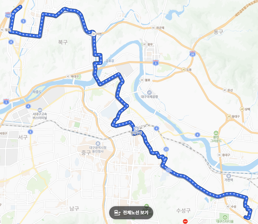 → 칠곡한라타운건너 → 한국도로공사앞 → 칠곡IC 2 → 칠곡한신아파트앞1 → 칠곡에덴타운앞 → 칠곡운암역1 → 한국농어촌공사앞 → 칠곡2차영남타운건너 → 부영5단지 → 부영3단지 → 칠곡그린파크2 → 강북경찰서앞 → 칠곡그린빌5단지건너 → 북구구민운동장건너 → 유니버시아드레포츠센터앞 → 동서변리벤빌 → 무태조야동행정복지센터앞3 → 동서교회건너 → 무태새마을금고앞 → 동변주공그린빌앞 → 유니버시아드선수촌2단지건너 → 무태네거리(시내방향) → 산업용재관 → 텍스빌 → 엑스코앞 → 동원약품 → 코스트코홀세일앞/복현화성타운건너 → 복현대백맨션건너 → 건영아파트건너 → 복현오거리1 → 영진전문대학교후문건너 → 영진고등학교건너 → 경진초등학교앞 → 경북대학교 경상대학앞 → 경북대학교정문앞 → 대구동부고용복지플러스센터 → 파티마병원건너1 → 동대구역건너 → 동대구역복합환승센터건너 → 경북아파트앞(신천동) → 팔공정보문화센터건너 → 메트로팔레스2 → 동원초등학교앞 → 청구시장건너 → 청구시장건너2 → 만촌태왕리더스건너(남편) → 만촌역서한포레스트앞 → 수성대학교앞 → 도시철도담티역(3번출구) → 대륜중고등학교앞 → 담티고개1 → 방공포병학교앞 → 연호동화훼단지1 → 수성알파시티역(5번출구) → 월드컵삼거리 → 고산농협창고앞 → 고산2동행정복지센터건너 → 고산역화성파크드림앞 → 대구농업마이스터고앞 → 신매역(3번출구) → 신매태성아파트 → 욱수초등학교건너 → 덕원고등학교건너