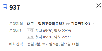대구 937번 버스 운행노선 덕원고등학교앞2 → 욱수초등학교앞 → 시지중학교 → 신매태성아파트건너 → 신매역(4번출구) → 대구농업마이스터고건너 → 고산역화성파크드림건너 → 고산2동행정복지센터앞 → 고산농협창고건너 → 월드컵삼거리앞 → 수성알파시티역(1번출구) → 연호동화훼단지2 → 방공포병학교건너 → 담티고개2 → 대륜중고등학교건너 → 도시철도담티역(1번출구) → 수성대학교건너 → 구.남부정류장앞1 → 만촌2동행정복지센터 → 만촌태왕리더스앞2 → 만촌태왕리더스북편 → 청구시장앞 → 만촌1동행정복지센터 → 메트로팔레스1 → 팔공정보문화센터앞 → 경북아파트건너(신천동) → 동대구역복합환승센터앞 → 동대구역 → 동대구역화성파크드림 → 평화시장(닭똥집골목)앞 → 공고네거리1 → 신암초등학교건너 → 경북대학교정문건너 → 경북대학교 경상대학건너 → 대구광역시립동부도서관 → 영진고등학교앞 → 영진전문대학교후문앞 → 복현오거리2 → 복현대백맨션앞 → 코스트코홀세일건너/복현화성타운앞 → 검단유성아파트(서편) → 대구우편집중국앞 → 엑스코건너 → 전자관 → 전자상가 → 산격거평타운앞 → 무태네거리(시외방향) → 유니버시아드선수촌2단지앞 → 동변주공그린빌건너 → 무태새마을금고건너 → 동서교회앞 → 무태조야동행정복지센터건너2 → 유니버시아드레포츠센터건너 → 북구구민운동장앞 → 칠곡그린빌5단지앞 → 강북경찰서건너 → 칠곡그린파크1 → 칠곡3차화성타운2 → 화성센트럴파크 → 칠곡2차영남타운앞 → 칠곡화성타운앞1 → 한국농어촌공사건너 → 칠곡운암역2 → 칠곡에덴타운건너 → 칠곡서한맨션앞 → 칠곡IC 1 → 한국도로공사건너 → 칠곡한라타운앞 → 관음변전소2 → 양지마을건너 → 칠곡우방타운앞(종점) → 칠곡우방타운건너(종점) → 양지마을앞 → 관음변전소1 → 관음변전소3