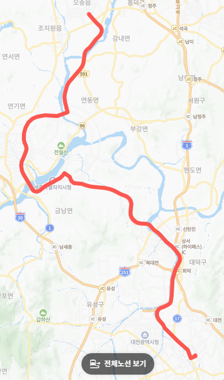 고속도로 및 전용 도로 이용: 중간에 갑천도시고속도로와 구즉세종로 등 무정차 구간이 긴 고속화 구간을 지나가, 대전 시내버스가 세종시로 진입하는 다른 노선보다 훨씬 빠르게 목적지에 도착합니다.