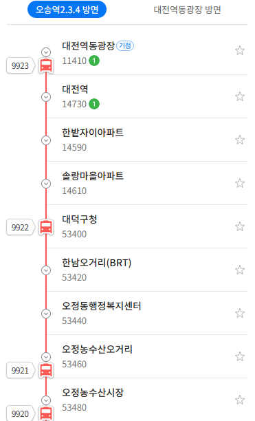 대전 B1번 버스 운행노선 대전역동광장→대전역→한밭자이아파트→솔랑마을아파트→대덕구청→한남오거리(BRT)→오정동행정복지센터→오정농수산오거리→오정농수산시장→대덕산업단지→한국개발연구원(KDI)→소담동(새샘마을)→세종시청.시의회.교육청→보람동.대평동→대평동(지하)→세종고속시외버스터미널(지하)→한솔동→새롬동.나성동→다정동→정부세종청사남측→정부세종청사북측→도담동→세종충남대학교병원→해밀동.산울동→한별동→누리동→오송역2.3.4→오송역