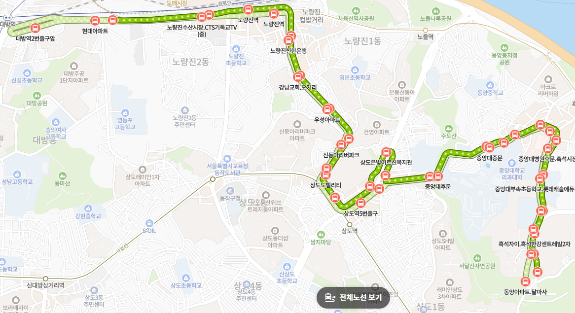 흑석동과 상도동 사이의 지형적 장벽을 상도터널 인근 경로를 통해 효율적으로 극복합니다. 두 동네 사이를 이동하거나 상도역을 거쳐 대방역 방면으로 빠르게 나갈 수 있는 가장 실질적인 지름길입니다.