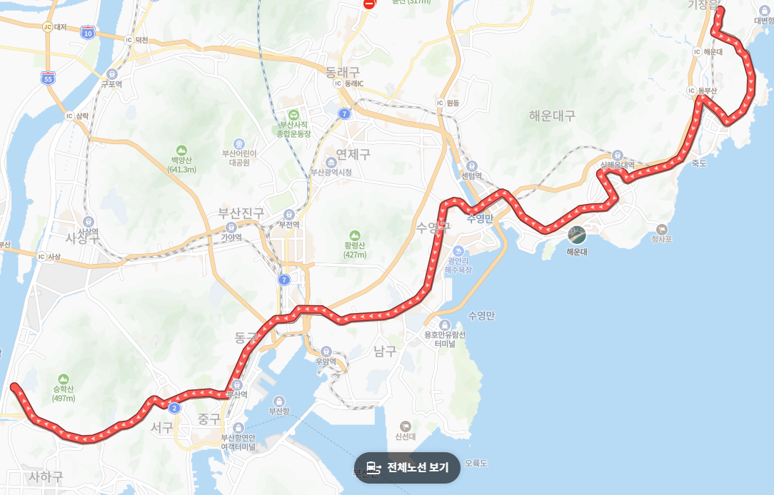 * 이용 팁: 워낙 인기가 많은 노선이라 출퇴근 시간대나 주말 피서철에는 경성대나 수영역 부근에서 이미 만차가 되어 무정차 통과하는 경우가 종종 발생합니다. 이럴 때는 실시간 도착 정보를 미리 확인하시고, 여유가 있다면 지하철을 혼용하시는 것이 좋습니다.