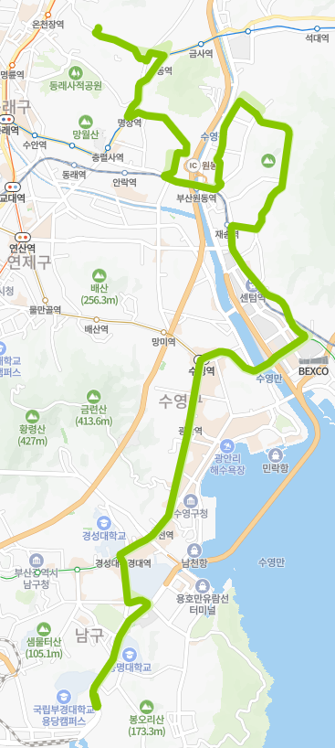 서동, 명장동, 반여동, 재송동, 센텀시티, 용당동 등 부산 동부 지역의 주요 주거 및 상업 지역을 연결합니다.