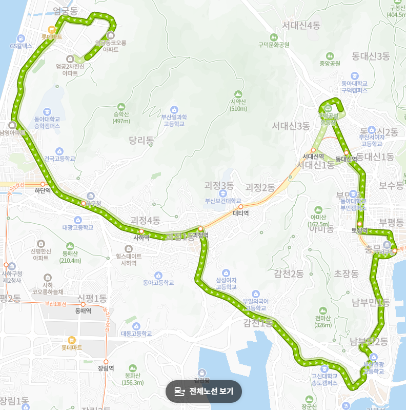 사하구와 서구의 핵심 연결: 기점인 엄궁동부터 시작해 하단, 사하역, 괴정 등 사하구의 주요 지하철역 및 상권을 지나, **감천동(삼성여고, 감천사거리)**을 거쳐 **고신대병원, 송도입구(송도윗길)**를 경유한 후 서구청, 동아대 부민캠퍼스, 구덕운동장까지 이어집니다.