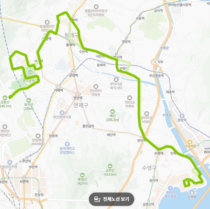 ● 다양한 환승 연계: 부산 도시철도 1호선(동래역, 명륜역), 2호선(수영역, 민락역), 3호선(사직역, 미남역, 수영역, 망미역), 4호선(미남역, 동래역, 수안역, 낙민역) 등 여러 지하철역과 연계되어 있어 다른 대중교통으로의 환승이 편리합니다. 특히 동해선 동래역과도 인접하여 동해선 이용객들에게도 유용합니다.