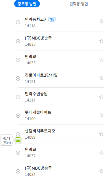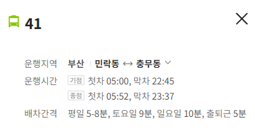 부산 41번 버스 운행노선 민락동차고지→(구)MBC방송국→민락교→진로아파트2단지옆→민락수변공원→롯데캐슬아파트→센텀비치푸르지오→민락교→(구)MBC방송국→민락동골목시장→광안농협앞→광안리해수욕장→광안리카페거리입구→광일맨션→수영구청→KBS방송국→대남교차로.남천역→경성대.부경대역→경성대학교→대연역→못골시장→남구청.못골역→대연고개→지게골역→문현교차로→범일교→부산진성공원→부산진시장→봉생병원→부산진역→YMCA→경남여중입구→초량역.초량교차로→부산역→영주동→중부경찰서삼거리→중앙역.부산우체국→부산데파트→남포역.옛시청교차로→남포동→자갈치역.비프광장