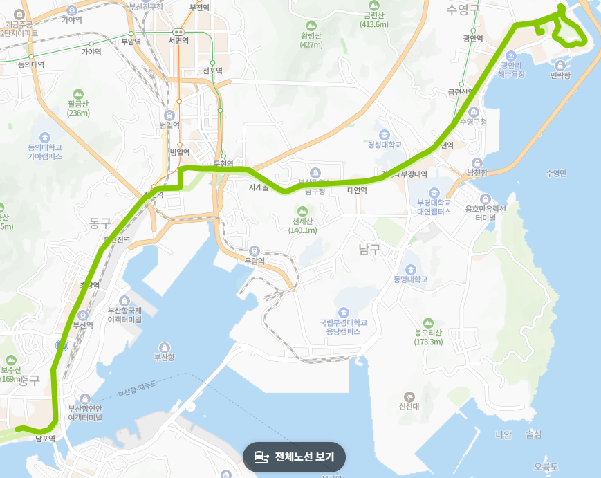 주요 관광지 및 번화가 연결: 광안리해수욕장, 부산역, 남포동, 충무동 등 부산의 핵심 관광지와 번화가를 경유하여 관광객과 시민 모두에게 유용합니다. 특히 부산역에서 광안리까지 가장 빠르게 연결되는 노선 중 하나로, 외지인들이 많이 이용합니다.