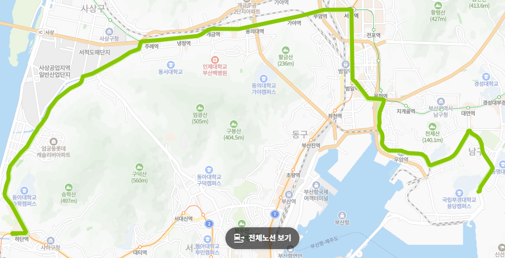 부산 도시철도 1, 2호선 주요 역들을 다수 경유하여 부산 전역으로의 환승 접근성이 매우 뛰어납니다.