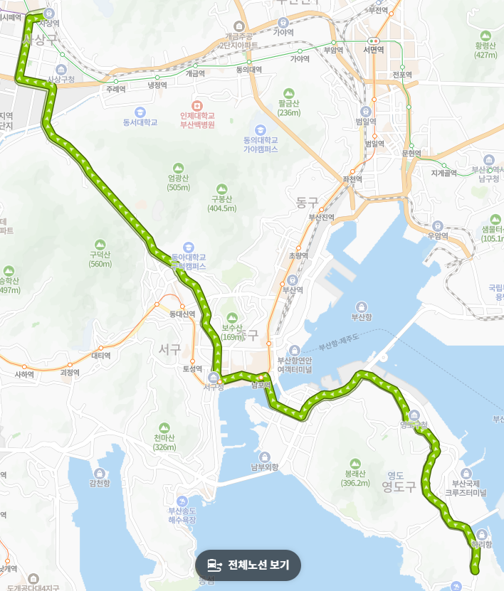 태종대(동삼동)에서 출발하여 남포동을 지나 사상(서부시외버스터미널)까지 부산의 주요 거점을 길게 연결합니다. 환승 없이 영도에서 사상까지 한 번에 갈 수 있는 몇 안 되는 노선으로, 장거리 이용객에게 매우 경제적입니다.