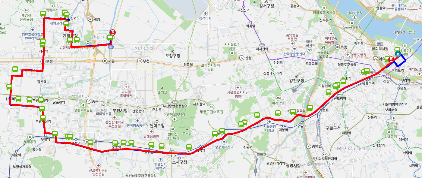 운행노선 대장공영차고지→봉오고가교(경유)→서운일반산업단지입구→계양체육관(아시아드양궁장)→계양체육관(벨로드롬경기장)→대동아파트후문→동보아파트→계양구청→계양경찰서→롯데마트계양점.고용복지센터→안산초등학교(구계산고교)→계양도서관→계산역→계산동수협→계산삼거리(신도브래뉴)→경인교대역입구→계양구의회→작전역8번출구→작전역5번출구→부평제이타워3차지식산업센터→동서식품→부평테크노타워→한국샤프(로얄금속)→광명아파트→영진아파트→청천치안센터→산곡동천주교회→산곡역6번출구→산곡역3번출구→한양아파트→경남1차아파트→KT부평지사→혜성프라자→부평여자고등학교→백마장입구→부평시장역→부평시장→부평역→굴다리오거리→동수교회→그린힐아파트.e편한세상아파트→부개농협→일신시장→일신동행정복지센터→부천시계→근로복지공단병원입구.송내자이아파트→송내사거리.송일초등학교→송내사회체육관.부천고.부천공고→남부천우체국→심곡동양파라곤→부천자유시장.심곡본1동행정복지센터→부천역남부광장→부천역전우체국→성지아파트.산성교회입구→소사역5번출구→소사구청삼거리.MJ컨벤션→괴안동입구.성심고가→역곡3동행정복지센터.현대정형외과→역곡역.역곡남부시장→역곡고가입구→유한대학교→성공회대학교유한공고앞→서울가든빌라앞→씨티월드→오류동역→오류1동주민센터.오류문화센터→경인중학교.개봉사거리(중)→개봉역.한마을아파트(중)→동양미래대학.구로성심병원(중)→구일역.제일제당(중)→신도림동.구로역(중)→신도림역(중)→문래동남성아파트(중)→남부지방법원등기국.구로세무서.에이스하이테크시티(중)→영등포역(중)→한국경제인협회→한국거래소→더현대서울→여의도환승센터(4번승강장)