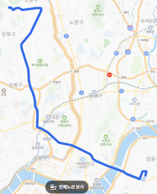 대학교 통학로 역할: 고려대역 근처를 지나기 때문에 고려대학교 학생들의 통학 수요를 분담합니다. 또한, 노선 주변의 주요 역(쌍문역, 수유역, 미아역, 미아사거리역, 답십리역, 장한평역, 군자역, 아차산역, 광나루역, 천호역, 강동역 등)을 경유하여 지하철과의 연계성도 뛰어납니다.