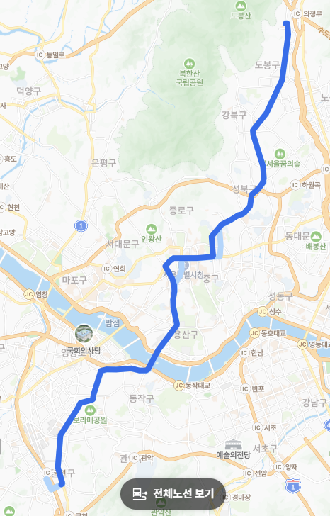 단 하나의 노선으로 대각선 이동: 서울의 가장 북동쪽인 도봉구(도봉산)에서 출발하여 도심(종로, 서울역)을 지나 가장 남서쪽인 금천구(기아대교)까지 이어집니다. 장거리 이동 시 환승 없이 서울 시내를 대각선으로 한번에 관통할 수 있다는 점은 이 노선의 가장 큰 장점입니다.
