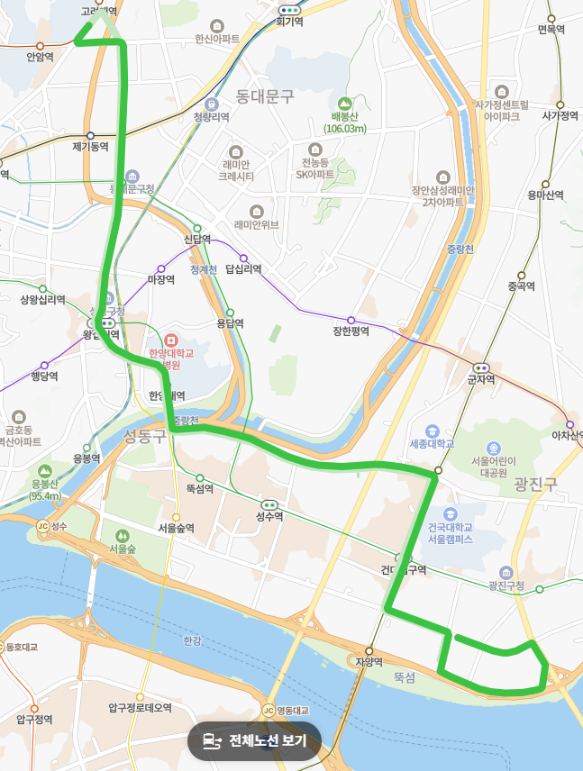 주요 거점 연결:장한평역, 건대입구역, 삼성역 등 주요 지하철역을 경유하여 환승이 편리합니다.