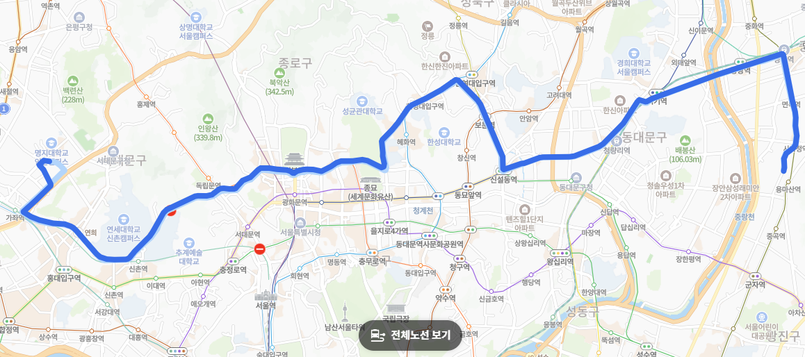 노선 자체가 매우 길기 때문에(기점에서 종점까지 편도 약 27~28km) 광범위한 지역을 커버하며, 중간 지역 간의 이동에도 큰 장점을 제공합니다. 예를 들어, 청량리/제기동에서 신촌/이대 방향으로, 또는 성북구에서 종로를 거쳐 마포구로 이동할 때도 환승 없이 이용할 수 있습니다.
