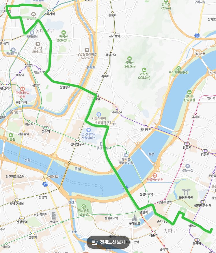 강동 지역에서 건대입구역으로 편리하게 이동할 수 있는 주요 노선 중 하나입니다.