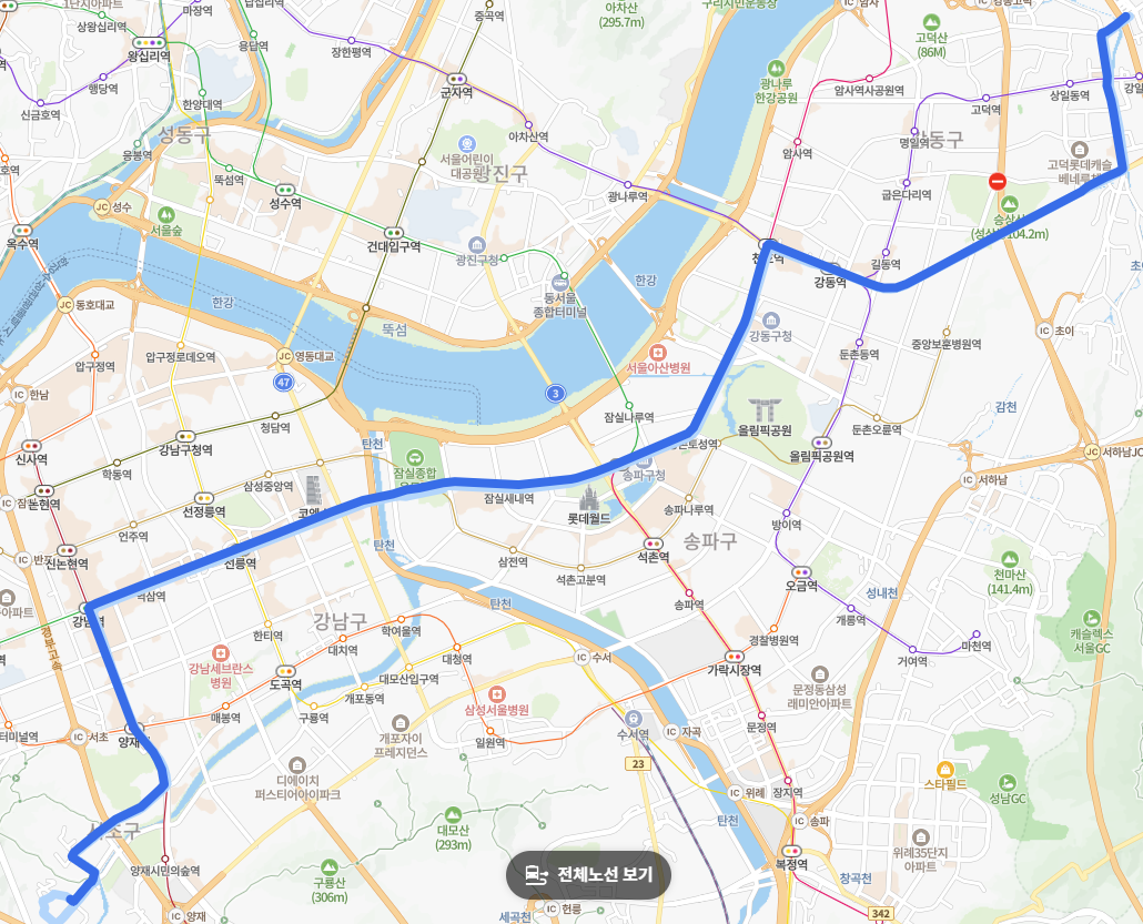 하남시(상산곡동)에서 강남역까지 환승 없이 한 번에 이동할 수 있어 편리합니다.